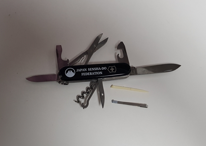 나이프가 대/소 2종, 캔따개를 겸하는 3mm 마이너스 드라이버, 병따개와 와이어 스트리퍼를 겸하는 6mm 마이너스 드라이버, 가위, 코르크 오프너, 멀티 훅, 리머(목재나 가죽 등에 구멍을 뚫는 도구), 이쑤시개, 핀셋(이 둘은 본체 외장에 수납)으로 13종의 도구와 함께 열쇠고리까지 기능의 하나로 취급하고 있습니다.