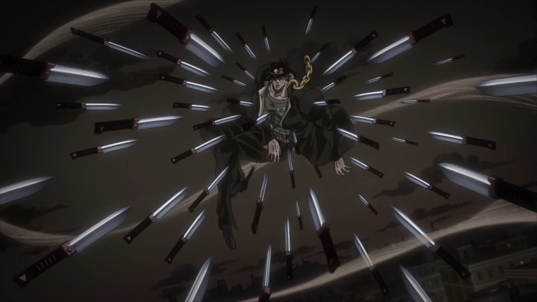 그러나 금세 체력을 회복한 DIO는 시간을 정지하고, 죠타로에게 수십 개의 나이프를 투척했습니다. 아무리 스타 플래티나라도 그 많은 나이프를 다 피할 수는 없는 상황. 그야말로 '체크메이트'였습니다.