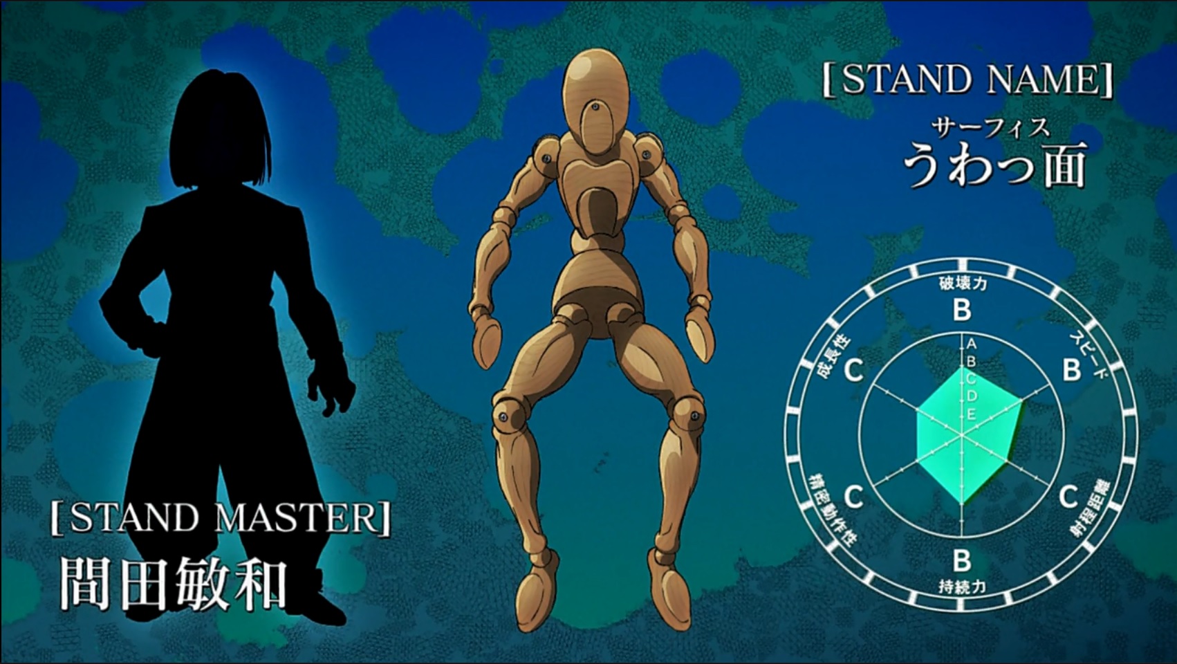이번에 소개된 스탠드는 하자마다 토시카즈의 '서피스' 입니다. 목각인형에 깃들어 있고 누가 건드리면 그 사람의 모양으로 변신하는 스탠드입니다.