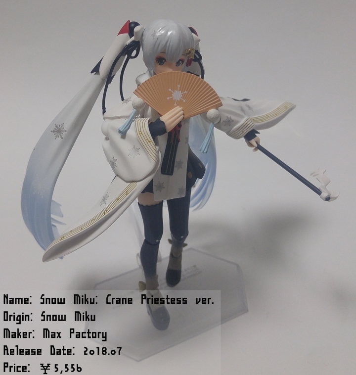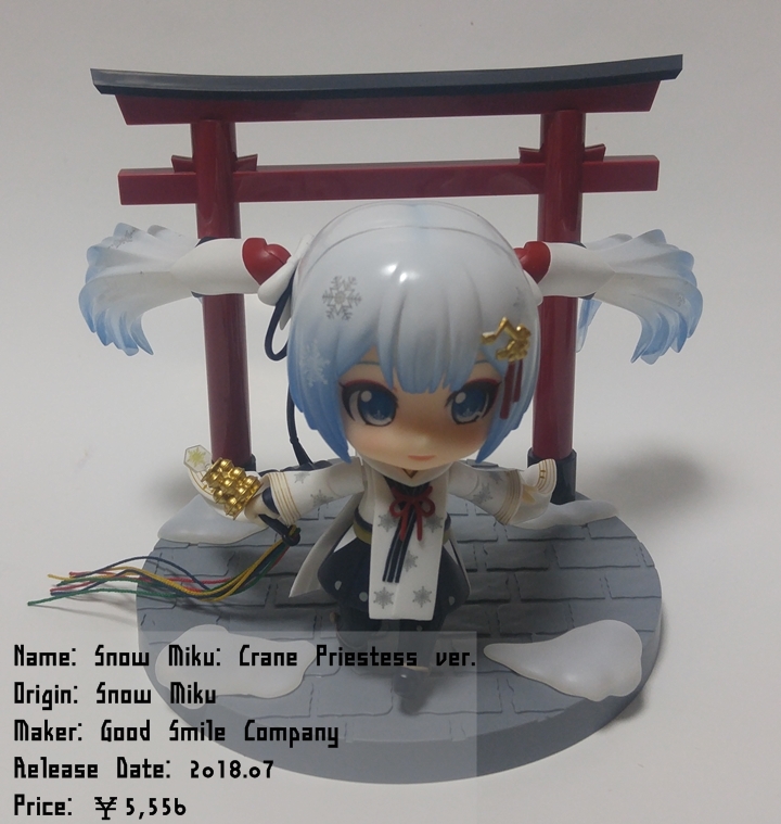 2018년의 겨울 원더 페스티벌에서 선행 발매된 EX-045번 유키미쿠 두루미 무녀입니다. 올해의 테마는 "홋카이도의 겨울을 이미지화한 동물"?이며 선택된 소재는 이름 그대로 고향 홋카이도의 도조(道鳥)이기도 한 "두루미"인 동시에 의상의 컨셉 역시 이름 그대로 "무녀".