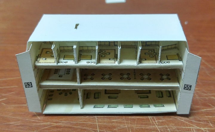 바닥과 중간의 수직 벽체 하나는 여러장을 겹처 붙여야 하고, 부품의 위치를 맞추기 위한 가이드가 있습니다만 실제로는 오히려 방해가 되는 수준이라 만드는데 제법 고생했네요. 이전의 경험으로 그대로 접착하면 필시 문제가 생긴다고 직감하고 미리 가조립을 해본 뒤에 조립하니 과연 목공풀의 수분으로 가이드가 비틀리면서 구멍에 들어가지 않아서 결국 가이드를 대충 쑤셔넣고 순간접착제로 고정해서 조립.