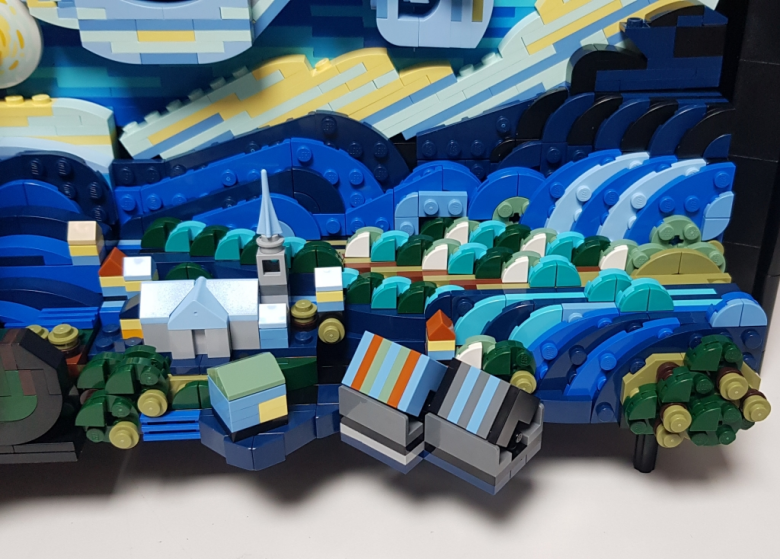 이 제품의 조립이 재밌는 점은 플레이트와 브릭을 층층히 쌓아올리고 이를 눕혀서 조립하는 것으로 작품에 풍부한 입체감을 부여하고 있습니다. 생 레미의 전경과 들판, 산과 언덕의 묘사를 실제의 그림과 비교해보면 이 제품이 고흐의 화풍을 모사하기위해 얼마나 노력했는지를 엿볼 수 있죠.