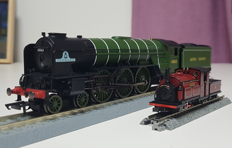 스몰 잉글랜드는 일단 OO-9이라 스케일 상으로는 같은 OO 게이지 차량일 터인데 표준적인 여객 견인 기관차인 토네이도 호가 무지막지하게 거대해 보이네요. 그럼에도 초록과 빨강의 원색 도장과 연실문-굴뚝 부근 머리 부분의 검은색 도장, 범퍼 전면의 붉은색 도장 등 영국제 기관차 특유의 디자인 요소를 공유하고 있는 면에서는 확실히 두 기관차가 같은 출신임을 도색만으로도 알 수 있네요.