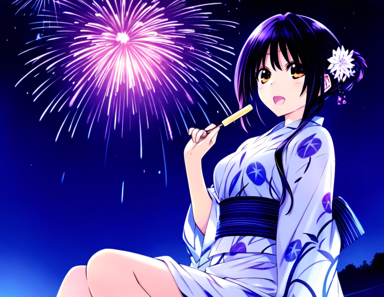 아이스캔디를 들고서 불꽃놀이를 감상하는 흑발 소녀의 모습.