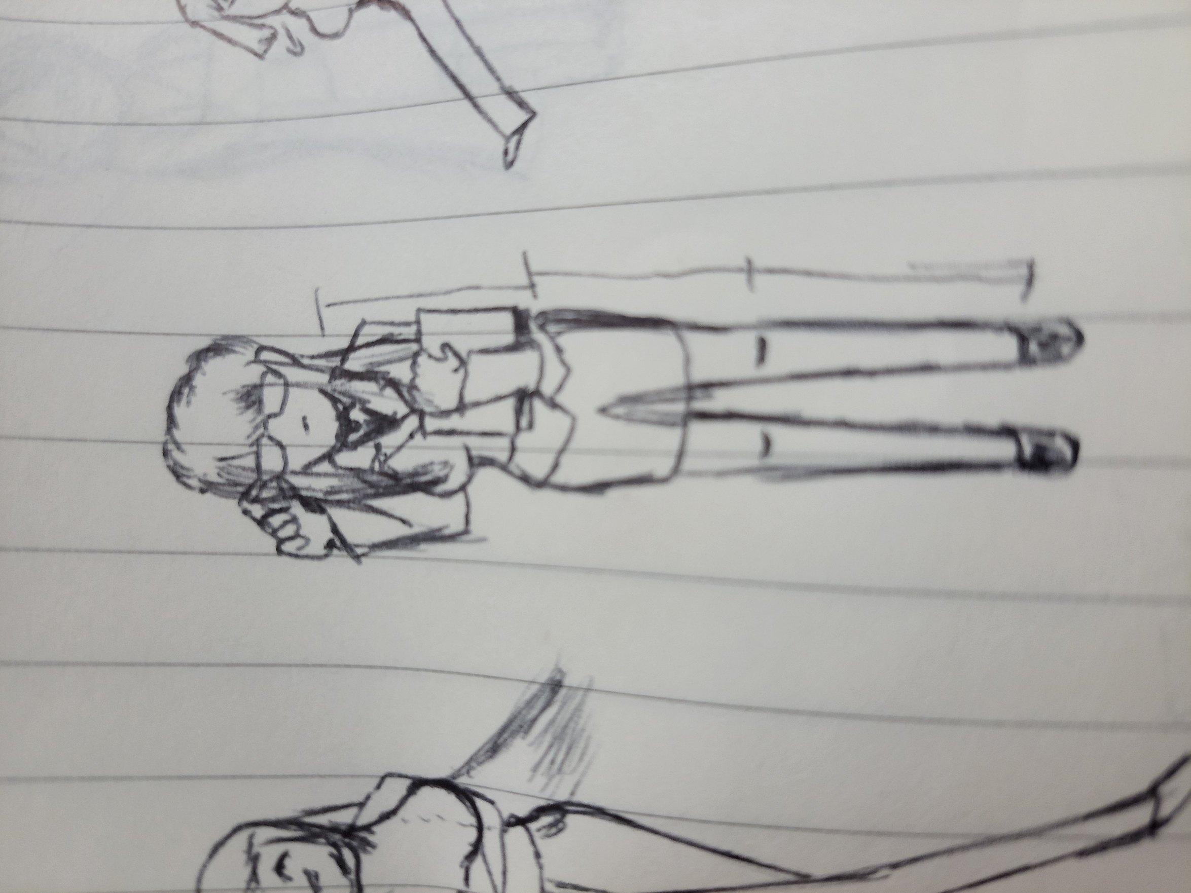 연습 4호. 그림 중에서는 순서상 초반에 속합니다. 얘는 반대로 다리가 너무 길지 않나 싶습니다. 무릎까지 그렸을 때 상상만으로는 비율 계산이 되지 않아 치마 위에 부득이하게 고간을 덧그렸는데, 그래도 무릎 아래가 너무 길지 않나 싶습니다. 그림에서 발목이 신발 끝이어야 하지 않나 싶습니다. 왼쪽에 찍으려다 포기한 그림도 허리에서 발끝까지가 너무 긴 것 같습니다.
