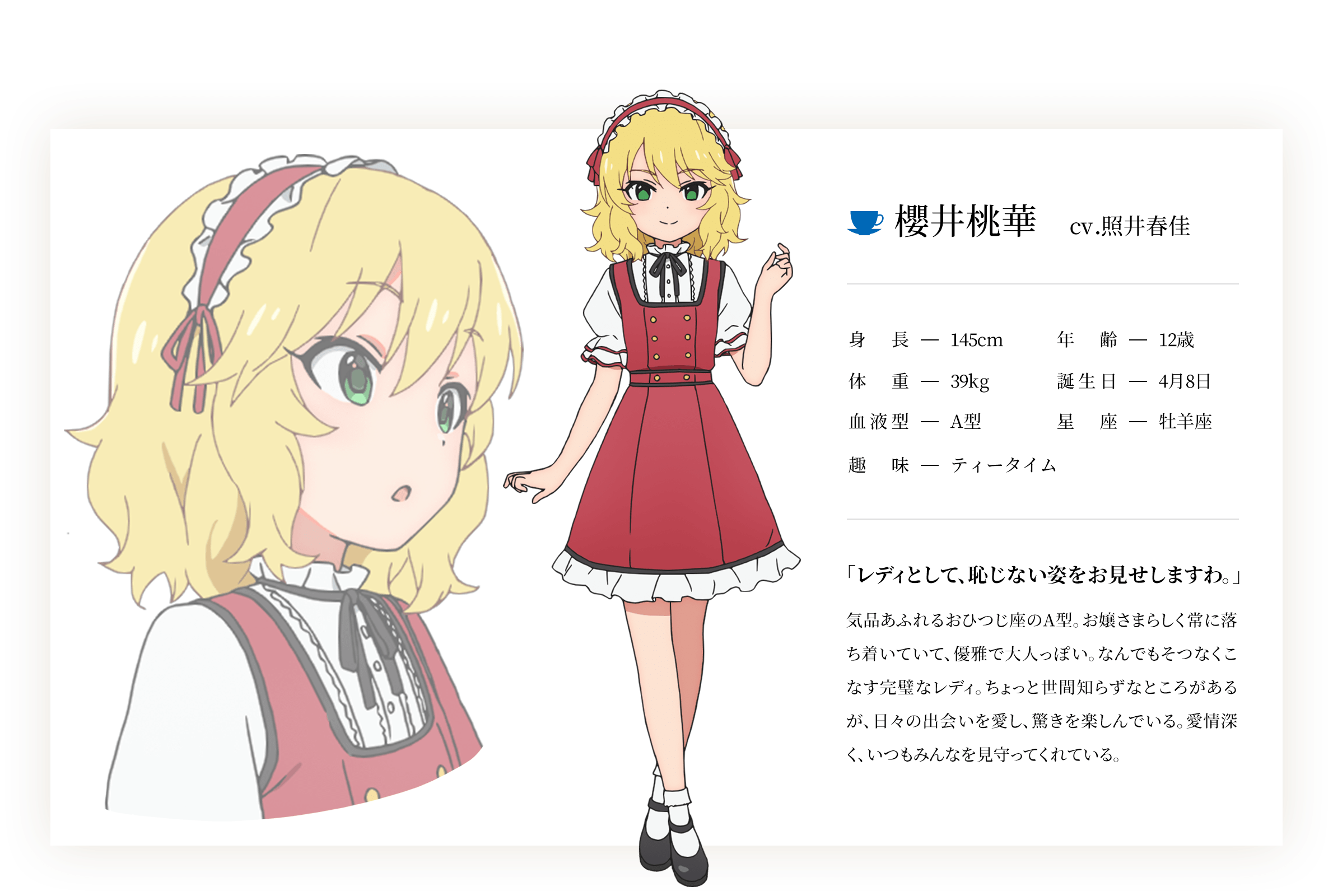사쿠라이 모모카의 프로필은 키 145cm, 연령 12세, 체중 39kg, 생일 4월 8일, 혈액형 A형, 별자리 양자리, 취미 티타임.