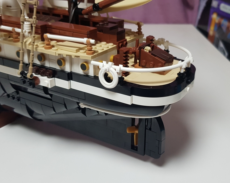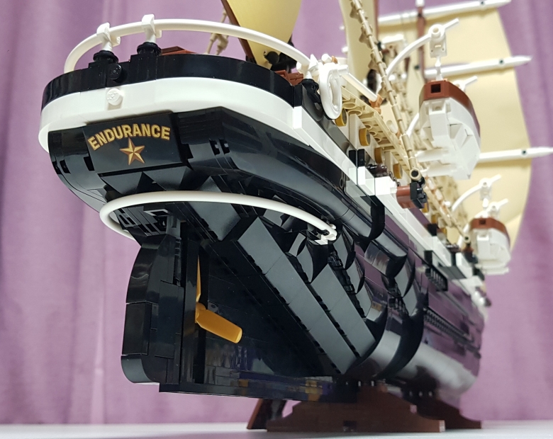 스크류는 원래는 검은색이지만 레고 제품은 검은 선체와의 대비를 주기위해 금색을 사용했다고 하는 등 매뉴얼 이곳저곳에 실제의 인듀어런스 호를 레고 제품으로 재설계하며 어떻게 재현하거나 각색했는지 해설을 곁들이고 있습니다. 쇄빙선의 역할도 겸해 설계된 뱃머리는 예각의 슬로프 브릭으로 처리했다고 해설하거나 배의 용골은 날렵한 실루엣을 살리기위해 1스터드 크기로 조립했다고 하는 등, 제품을 만들기위해 고심한 디자이너의 설계를 엿볼 수 있었네요.