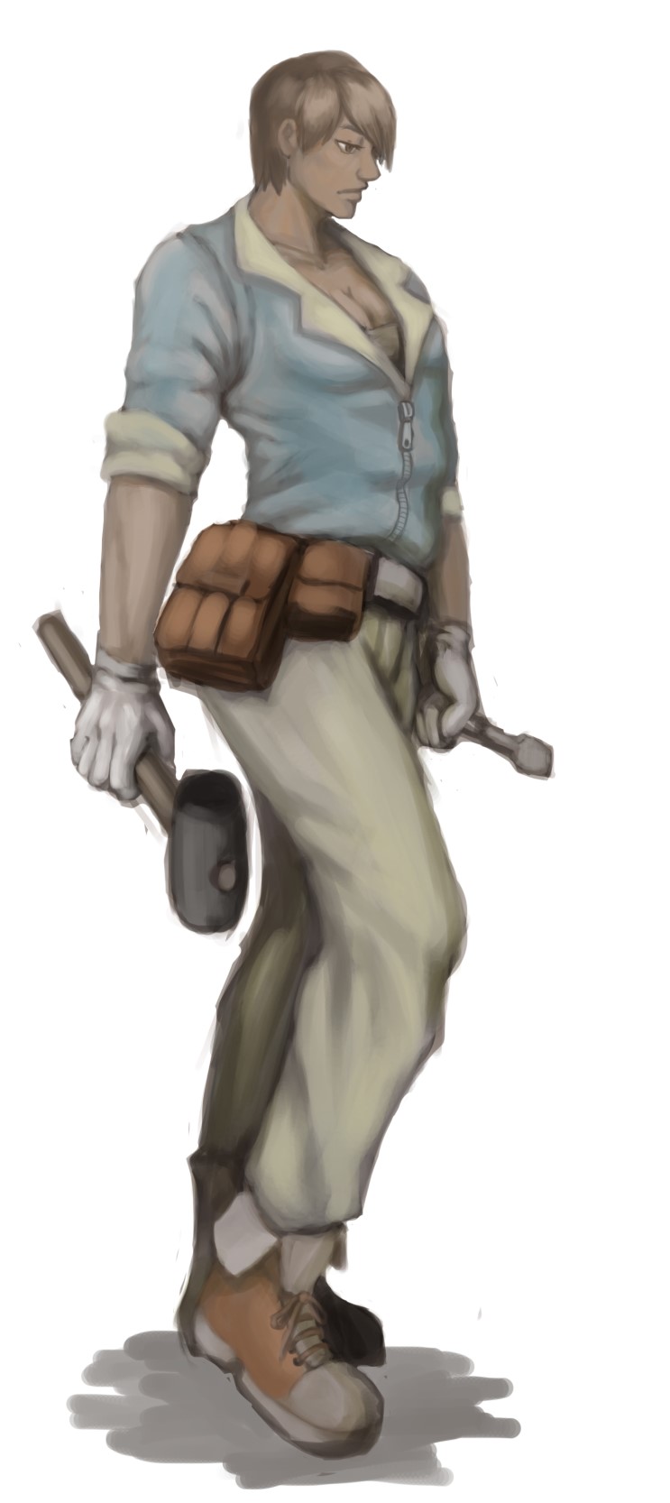 처음에는 그냥 주목같은 나무를 조각칼로 파는 조각가로 생각해서 날씬한 타입이였는데, 동영상으로 나무조각하는 것을 보니 전기톱도 쓰고 온갖 중장비를 다 쓰는 것을 보는 순간 '아 날씬한 모습으로 조각하는건 영 아니구나' 라는걸 깨달아서 상체근육이 훌륭한 근육미녀로 탄생하였습니다. 그리고 중장비를 다루는데 머리가 길면 위험할것 같아서 시원하게 잘라버렸습니다. 그래서 정말 누구세요 상태가...