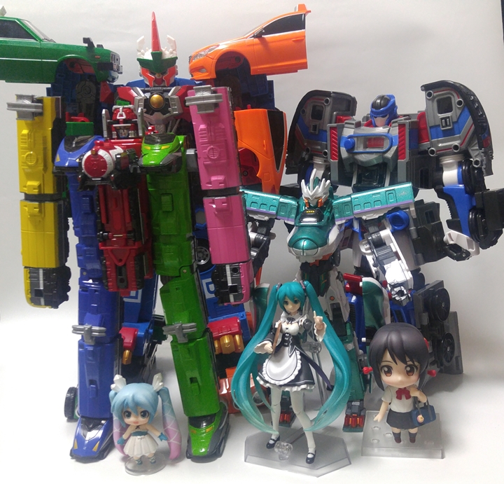 (오른쪽은 동급의 크기와 체격을 갖춘 애슬론 또봇 시즌 3의 메트론, 앞쪽은 왼쪽부터 figma 하츠네 미쿠, 신카리온 H5계 하야부사, 넨도로이드 미야미즈 미츠하, 넨도로이드 푸치 하츠네 미쿠)