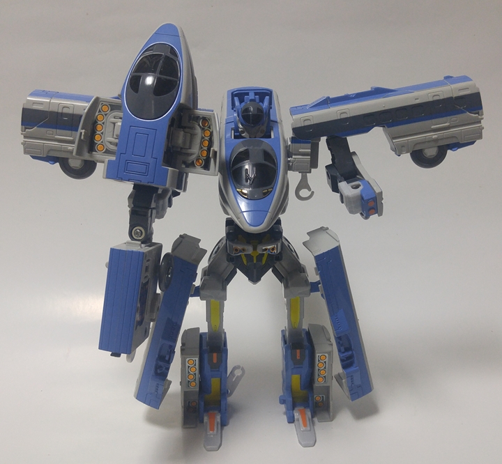 일단 디폴트 세팅은 주인공 기체인 E5 하야부사로 정해져 있습니다만, 하야부사?베이스 신카리온은 어느 것이든 합체시킬 수 있으므로 가지고 있는 H5 하야부사로 대용. 1호 선두차와 4호 후미차가 통째로 거대하고 두꺼운 양팔이 되고, 빈약한 하반신도 3호차가 합체하는 것으로 보강되어 기존의 신카리온들과 차별화되는 강고한 인상을 줍니다.