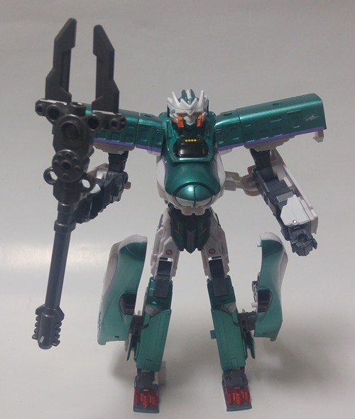 커진 체격에 걸맞게 무기도 커지니 확실히 인상이 다릅니다. 디폴트 사양은 윗사진 대로지만 이런 류의 완구가 다 그렇듯 조인트 규격은 공용이므로 다른 제품의 무기를 사용하거나 아예 전부 다 조인트가 맞는대로 갖다 끼워서 자신만의 무기를 만들어도 무방.