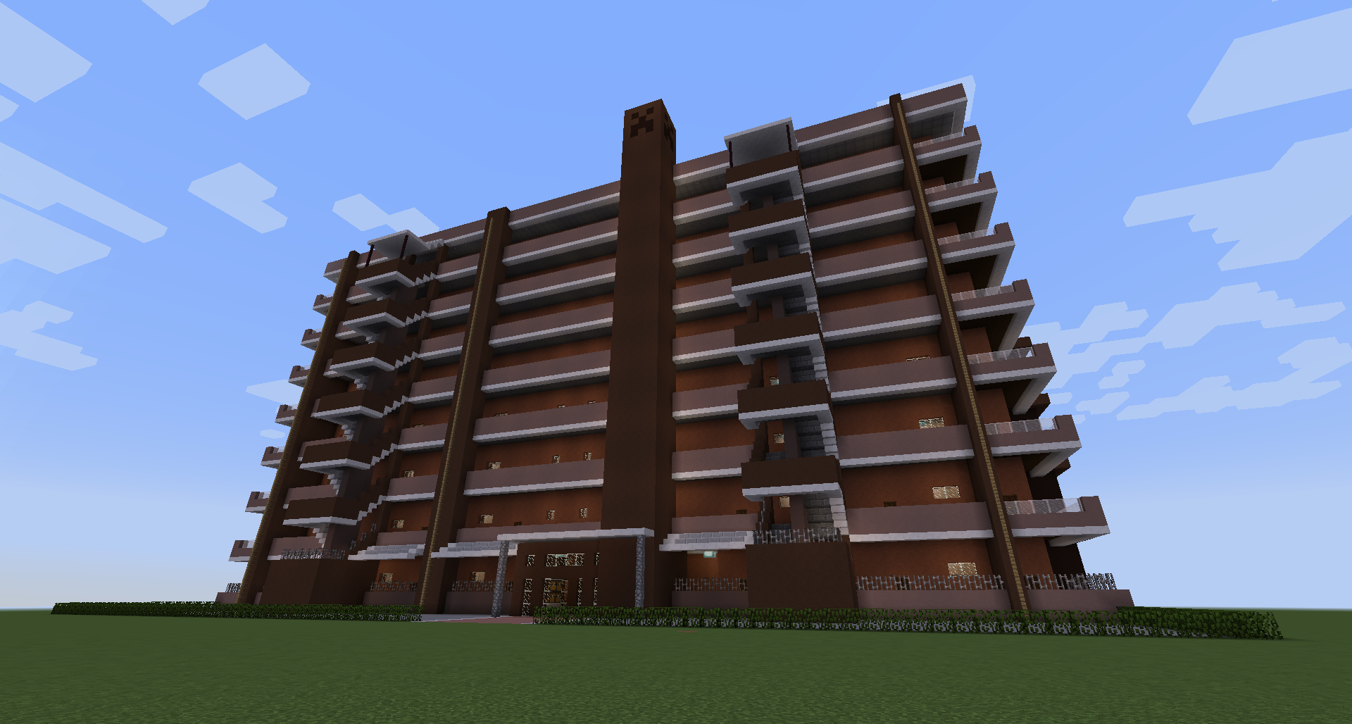 가로 91 블록, 세로 45 블록, 높이 66 블록으로 덩치에 걸맞게 옥상까지 9층에 약 47세대가 거주 가능한 대형 주택건물입니다.