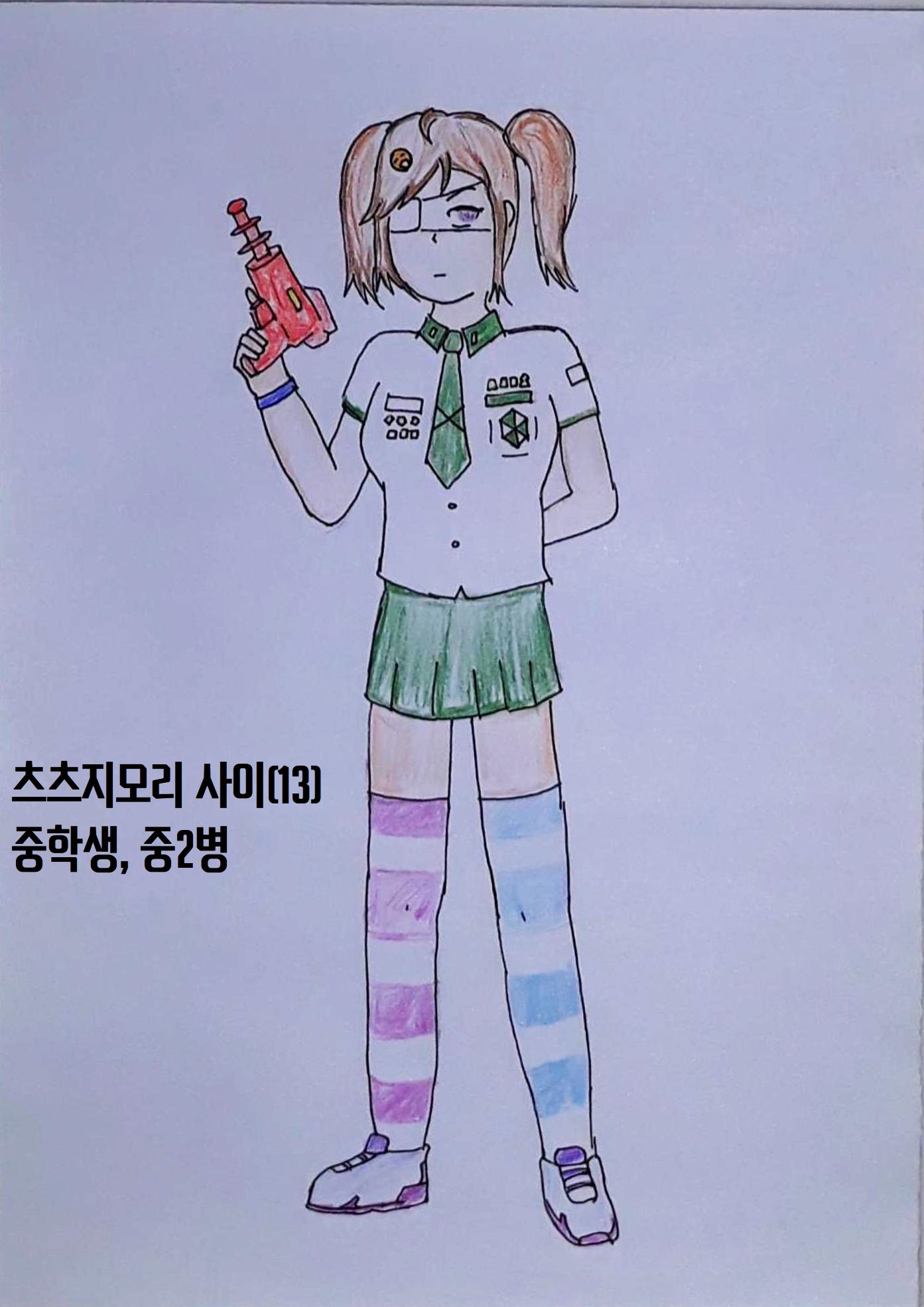 한 눈에 안대를 하고 있고 광선총을 손에 들고 있고 좌우 색깔이 다른 양말의 츠츠지모리 사이...