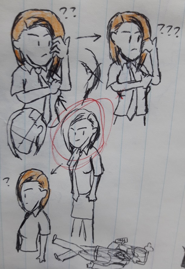 그 밖에 여캐의 다리는 또 따로 연구를 해야 할 만큼 못 그려서 적당히 그려넣었는데... 검은 스타킹에 장화(?) 같은 건 그렇다쳐도 다리가 벌어진 게 어색하네요. 적어도 저한테는요. 그래서 희망사항으로 오른쪽에 다리를 모은 자세를 따로 추가하긴 했습니다만... 희망사항이죠. 아마 위에 사라진(...) 서류철이나 머리카락 잡선 등을 고려해서 다시 그린다면 좀 더 그럴듯하게 나오지 않을까 싶습니다.