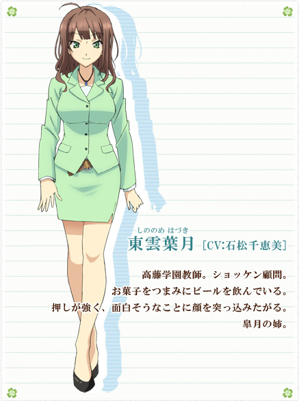 사랑과 선거와 초콜렛의 캐릭터 시노노메 하즈키(東雲葉月). 작중 배경인 타카후지 학원의 교사로 많은 경우에 이 복장으로 출연하고 있어요.