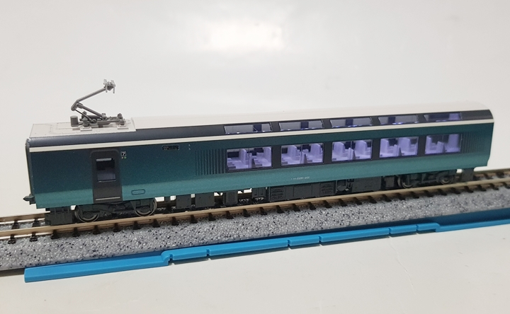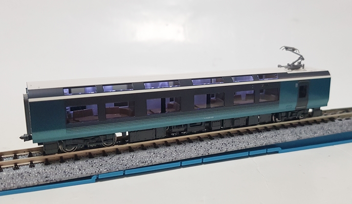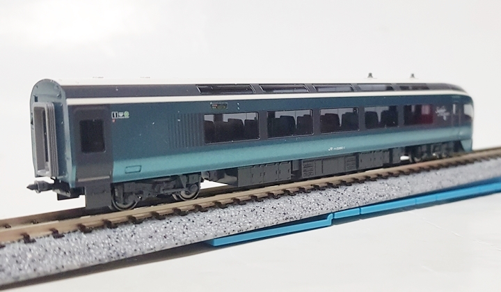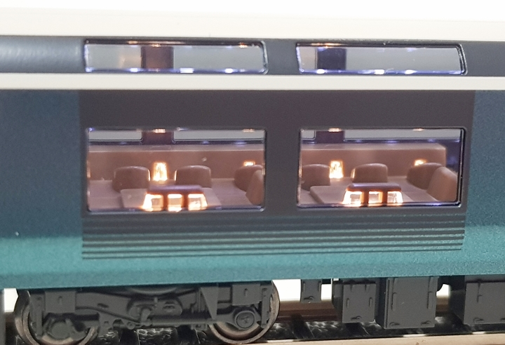 전차량 그린차인 사피르 오도리코에서도 최고급인 프리미엄 그린차 사양으로 전좌석 1+1 배열에 전동 리클라이닝 시트라는 최고급 사양을 자랑합니다. 비취색, 화이트, 그레이의 차분한 컬러링과 관광열차다운 세련된 디자인이 무척이나 마음에 드는 차량이네요. 창문은 전부 스모크 그레이로 재현되어 있습니다.